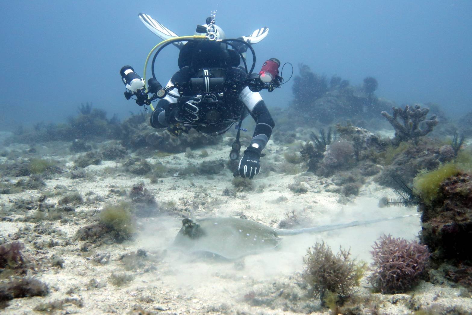 Scuba diving in ShanFu, XiaoLiuQiu we often come across blue spotted rays in the sand.. Here is a compilation of a few encounters during the last trip