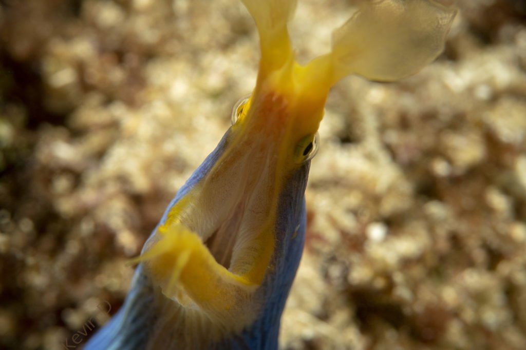 An interesting fact; ribbon eels are born male, and later become female. The males are black body with orange stripe, while the females are blue body with yellow. A real treat is to find a ribbon eel during its sex change, at this time they are normally black with yellow stripe.