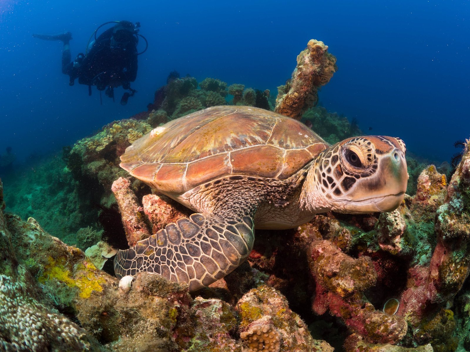 Green sea turtle on reef with scuba diver